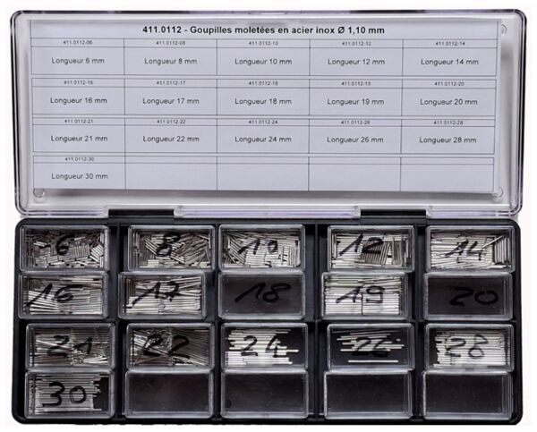 Assortiment de 970 goupilles moletées acier Ø 1.10 mm avec étui et boîtes