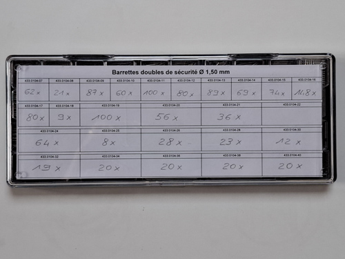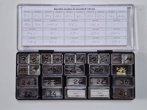 Assortiment de 1'300 barrettes doubles de sécurité ac inox Ø 1.50 mm avec boîtes.
