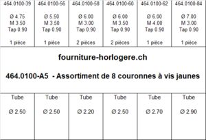 Assortiment de 8 couronnes à vis avec tube et joint Tap 0.90 mm jaunes