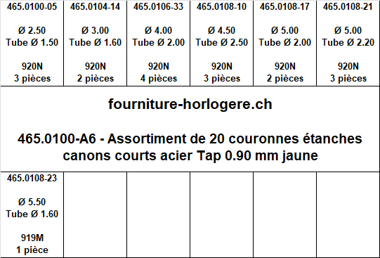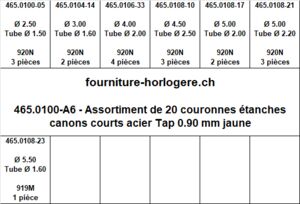 Assortiment de 20 couronnes étanches acier inox canon court acier inox Tap 0.90 mm jaune